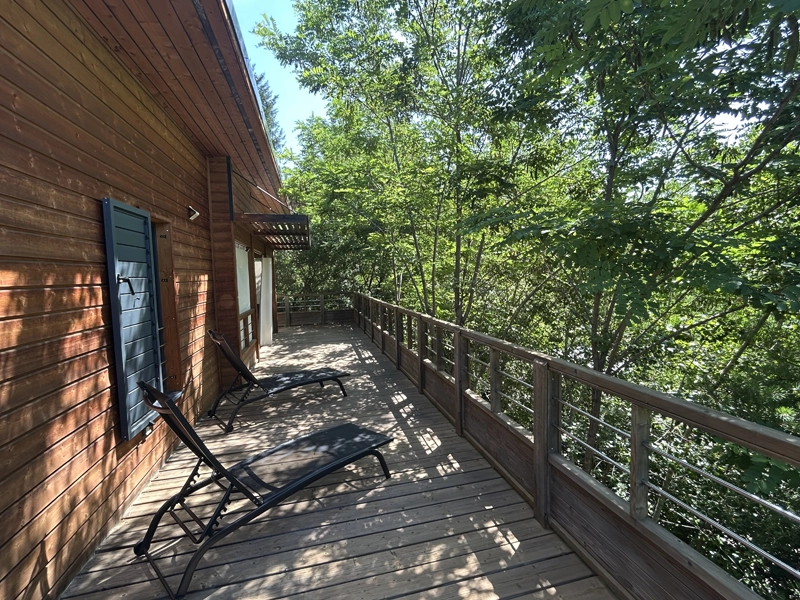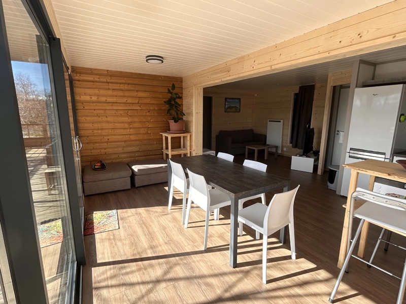 Sa grande terrasse et ses ouvertures sur l’extérieur permettent de profiter pleinement du calme et de l’ombre naturelle des arbres, idéale lors des journées ensoleillées.