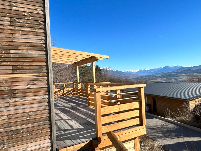 Un lodge moderne et lumineux, idéal pour un séjour en couple face à un panorama ouvert sur la vallée et les montagnes.